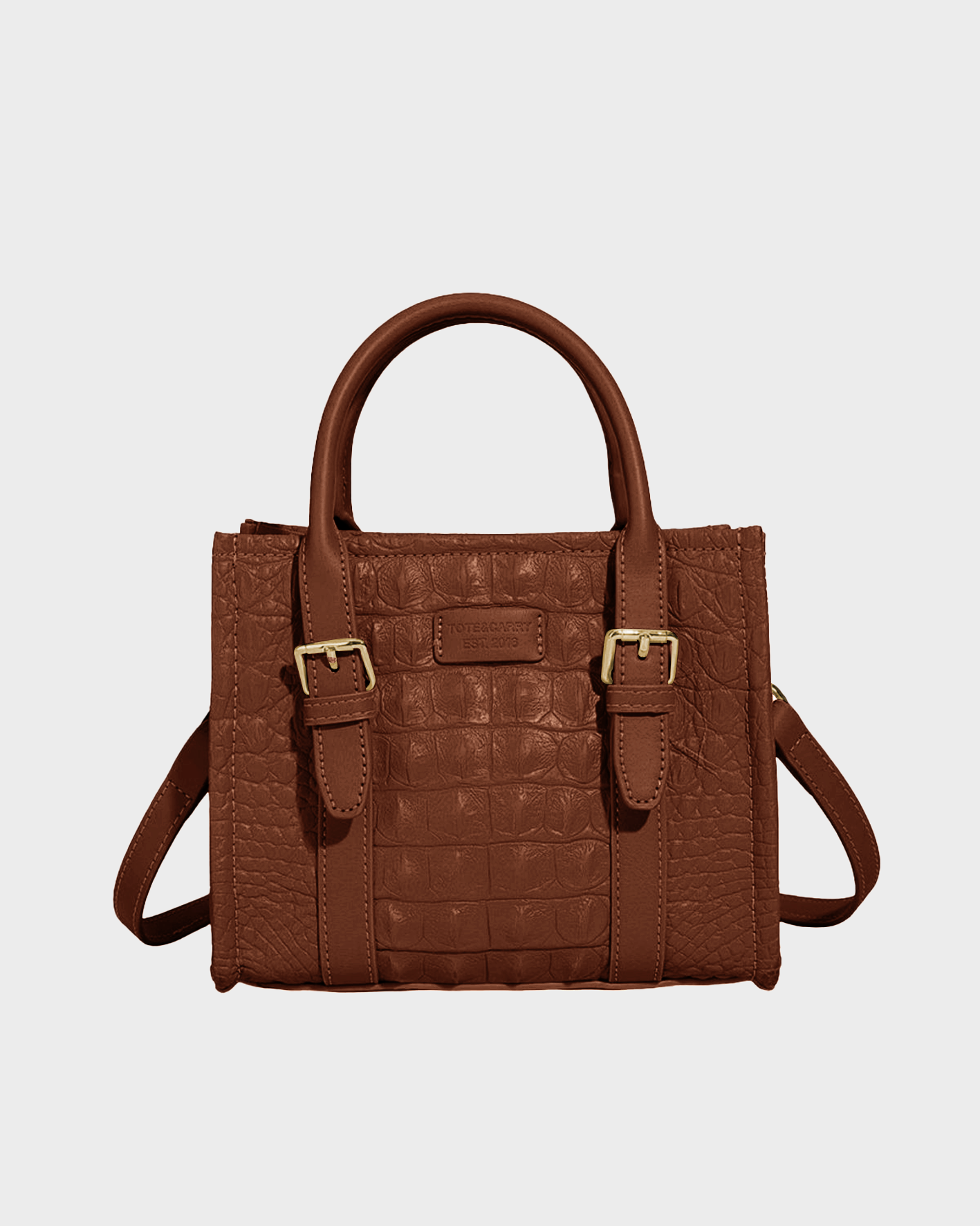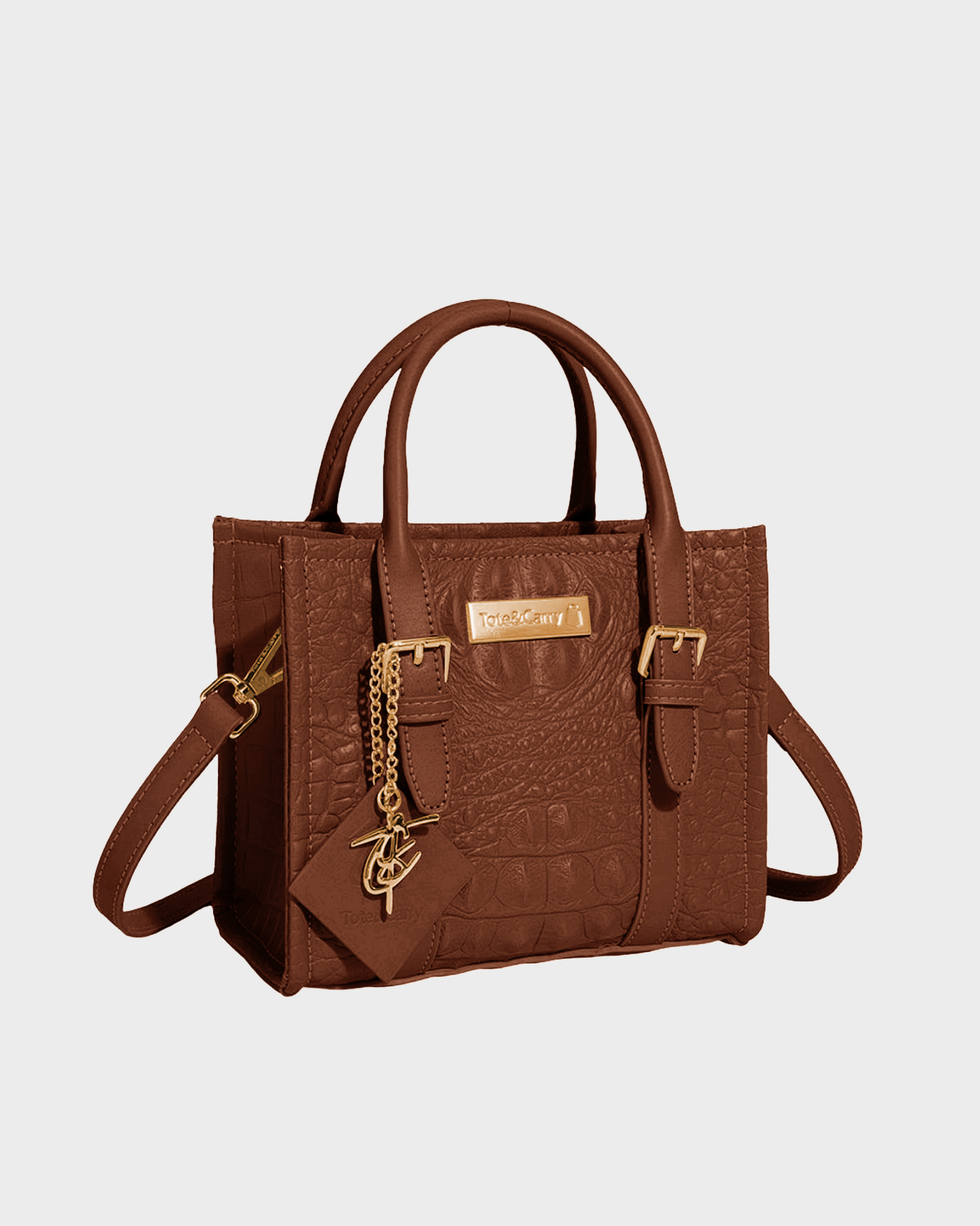 Compact size meets major luxury in the Tote&Carry Apollo 2 Mini Tote Bag! Presented in rich Chocolate brown, this structured cutie makes a sophisticated statement wherever you carry it. The stunning crocodile-embossed faux leather gives it an exotic, high-fashion edge, perfectly complemented by gleaming gold-tone hardware and signature charm details. Ideal for carrying your essentials in elevated style, it transitions effortlessly from brunch dates to evening outings. Petite perfection with a powerful presence.