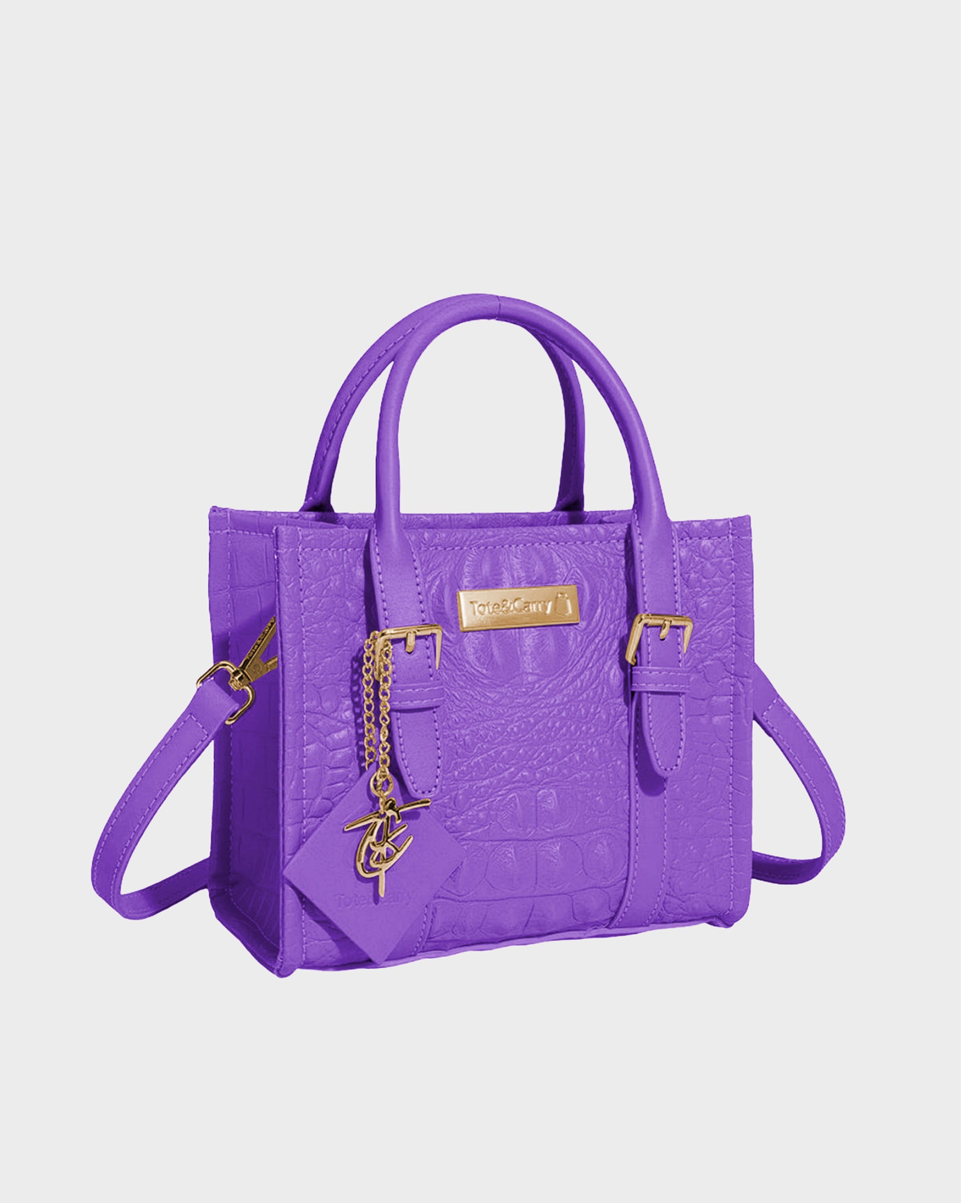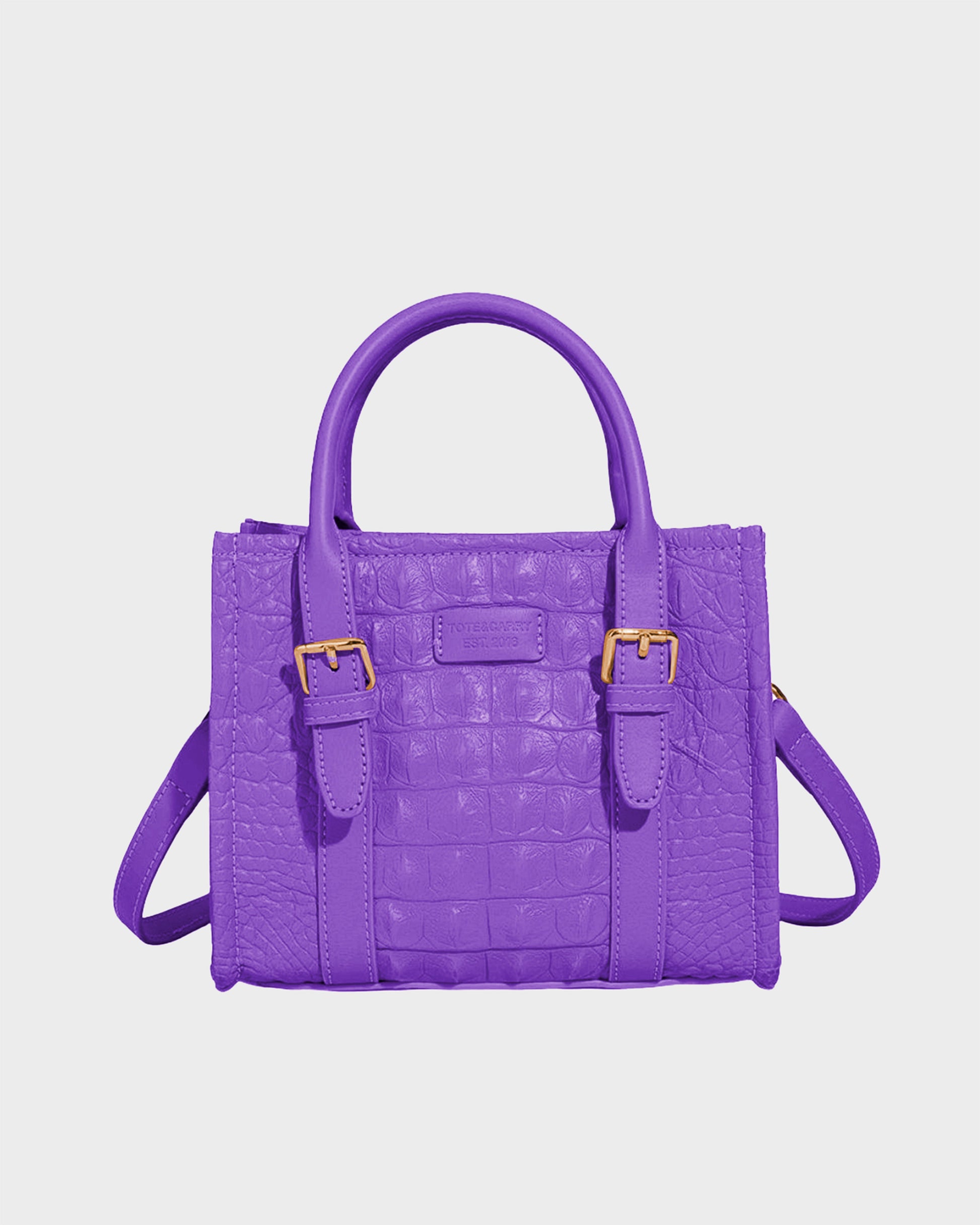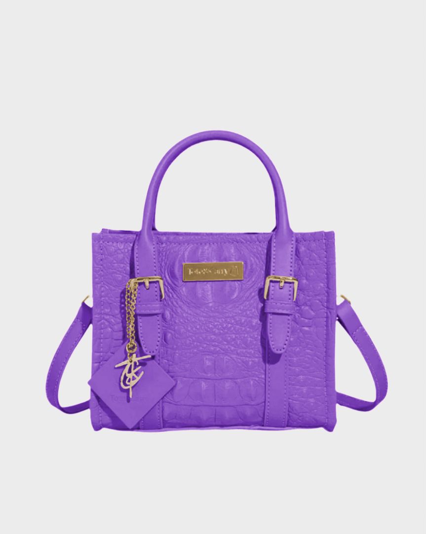 Add a touch of whimsical charm to your look with the Apollo 2 Mini Tote Bag in Lavender. This eye-catching tote features a unique lavender hue that adds a soft and feminine touch to any outfit. The luxurious crocodile-embossed texture and polished hardware create a sophisticated look, while the compact size and detachable shoulder strap offer versatile carrying options. Perfect for adding a touch of playful elegance to your everyday style.