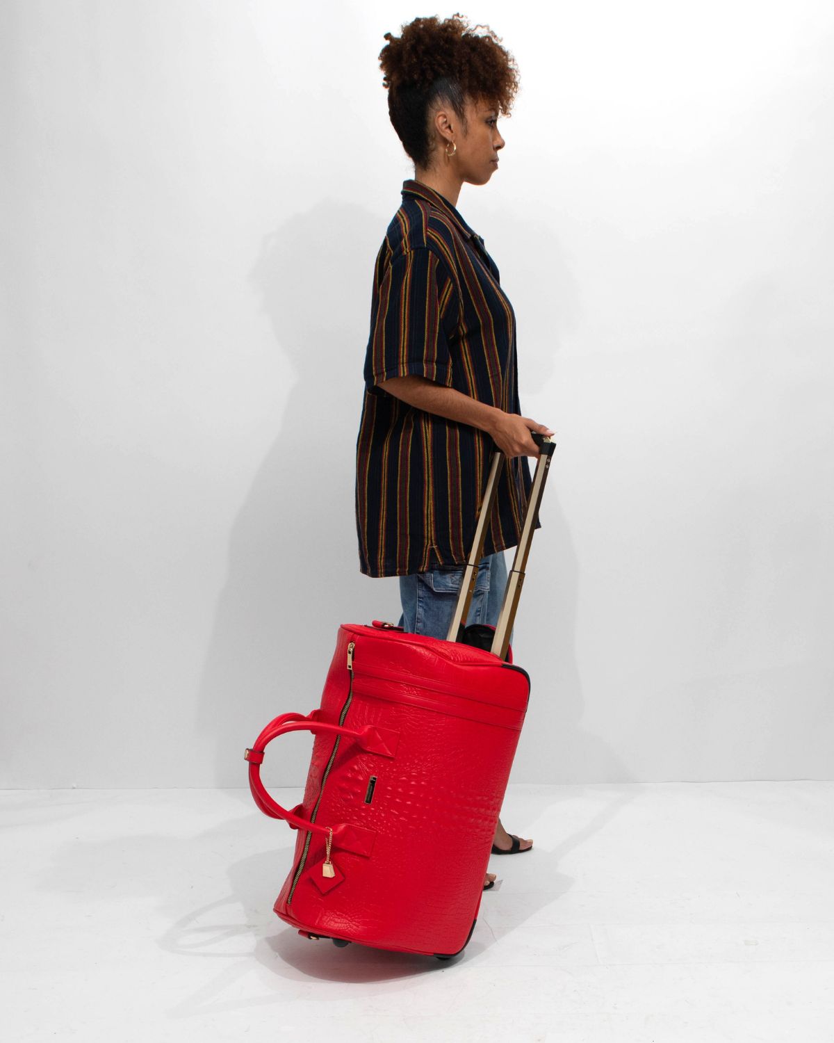 Make a bold statement with the Apollo 2 Rolling Duffle Bag in Red. This eye-catching piece is crafted from premium faux crocodile skin leather in a vibrant red hue that's sure to turn heads.