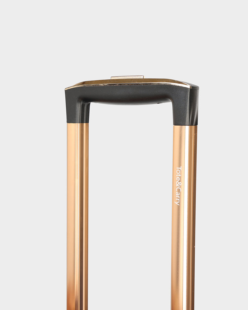 Zipper pouches - front and back adorned with heavy gold hardware - offer on the go convenience. Color-coded cushion handles and a pull-up chrome ?top handle top travel-friendly features.?Smooth-moving, Gold Chrome Wheels outfit you through your next travel adventure.?
