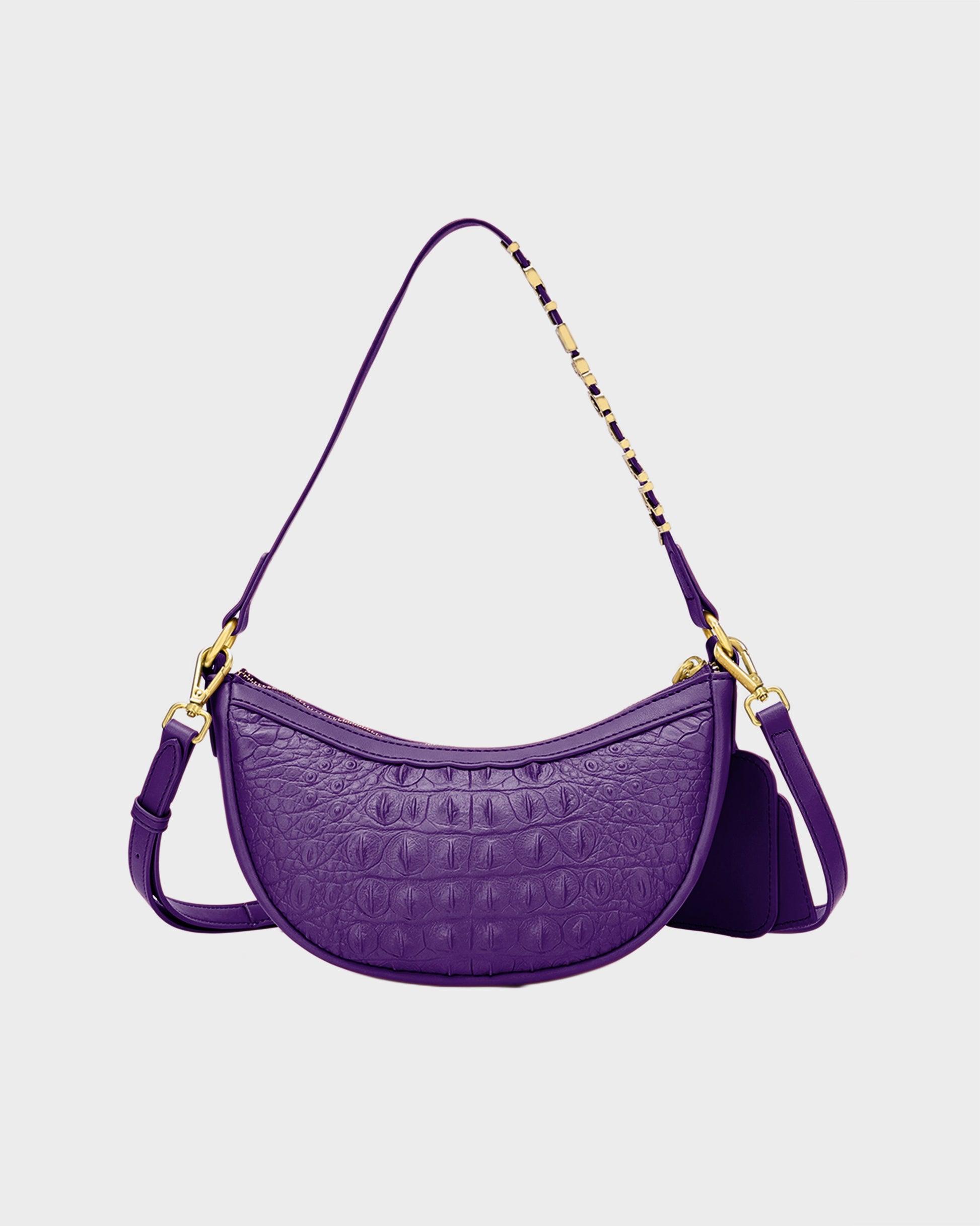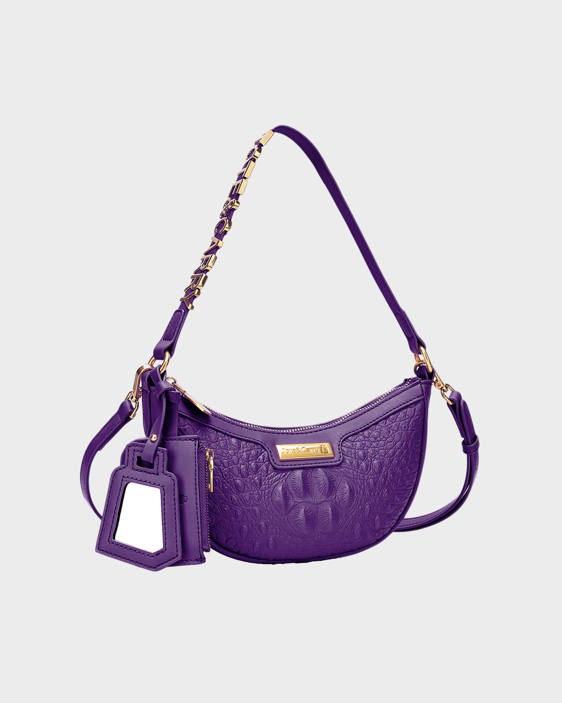 Embrace regal chic with the Tote&Carry Cutie Shoulder Purse in stunning Purple! This trend-perfect crescent bag fits beautifully under the shoulder, making an instant style statement. Crafted from eye-catching crocodile-embossed faux leather, its rich purple hue and luxe texture radiate sophistication and confidence. Polished gold-tone hardware, including elegant strap detailing, a signature logo plate, and a practical attached mirror tag, completes the high-fashion look. It's the perfect accessory to elevate any outfit, day or night.