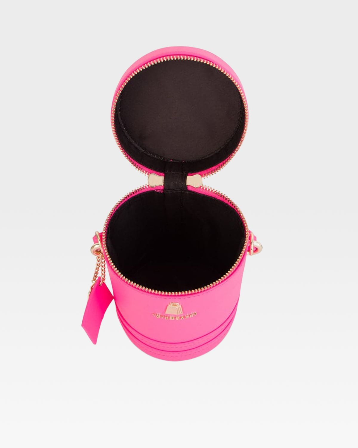 A Bold Statement in Pink! The Mini Barrel Purse in Neon Pink is a bold and stylish accessory that's perfect for the fashion-forward individual. This unique purse features a cylindrical shape with a gold-tone hardware and a detachable chain strap.
