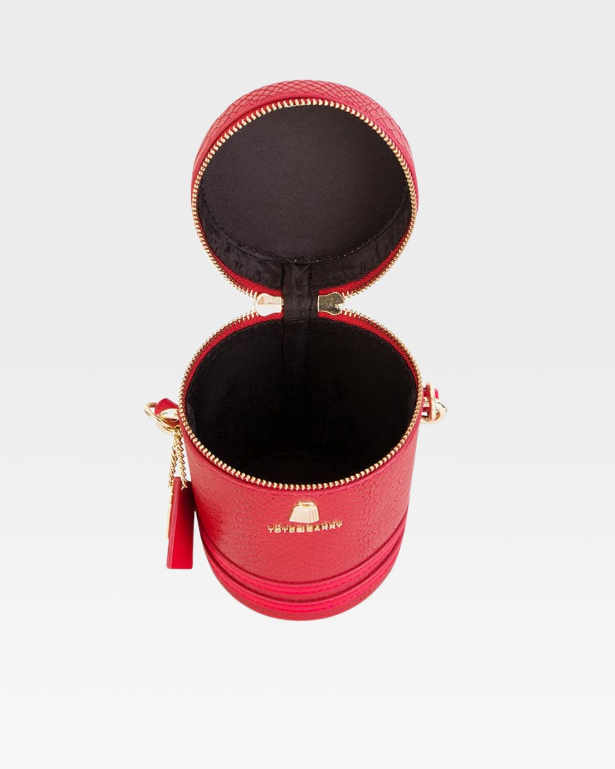 A Bold Statement in Red! The Mini Barrel Purse in Red is a bold and stylish accessory that's perfect for the fashion-forward individual. This unique purse features a cylindrical shape with a gold-tone hardware and a detachable chain strap.