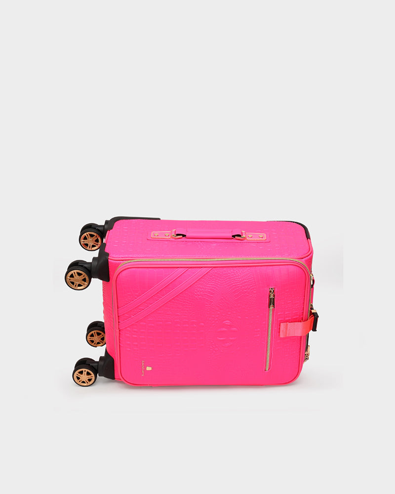Zipper pouches - front and back adorned with heavy gold hardware - offer on the go convenience. Color-coded cushion handles and a pull-up chrome ?top handle top travel-friendly features.?Smooth-moving, Gold Chrome Wheels outfit you through your next travel adventure.?