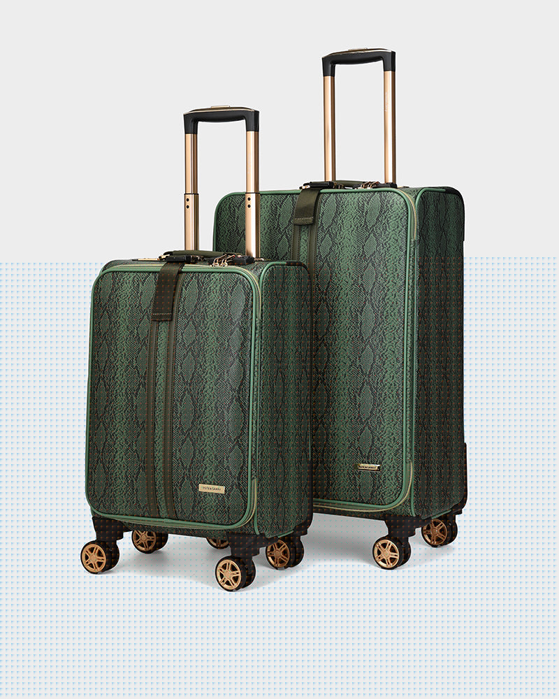 The set includes a medium-sized suitcase and a compact carry-on, both featuring a rich olive hue and a sleek python pattern that exudes sophistication. The sturdy yet lightweight construction ensures easy maneuverability, while the 360-degree spinner wheels provide effortless gliding through crowded airports. With gold-tone accents and high-quality zippers, these suitcases not only look stunning but are built to withstand the rigors of travel.