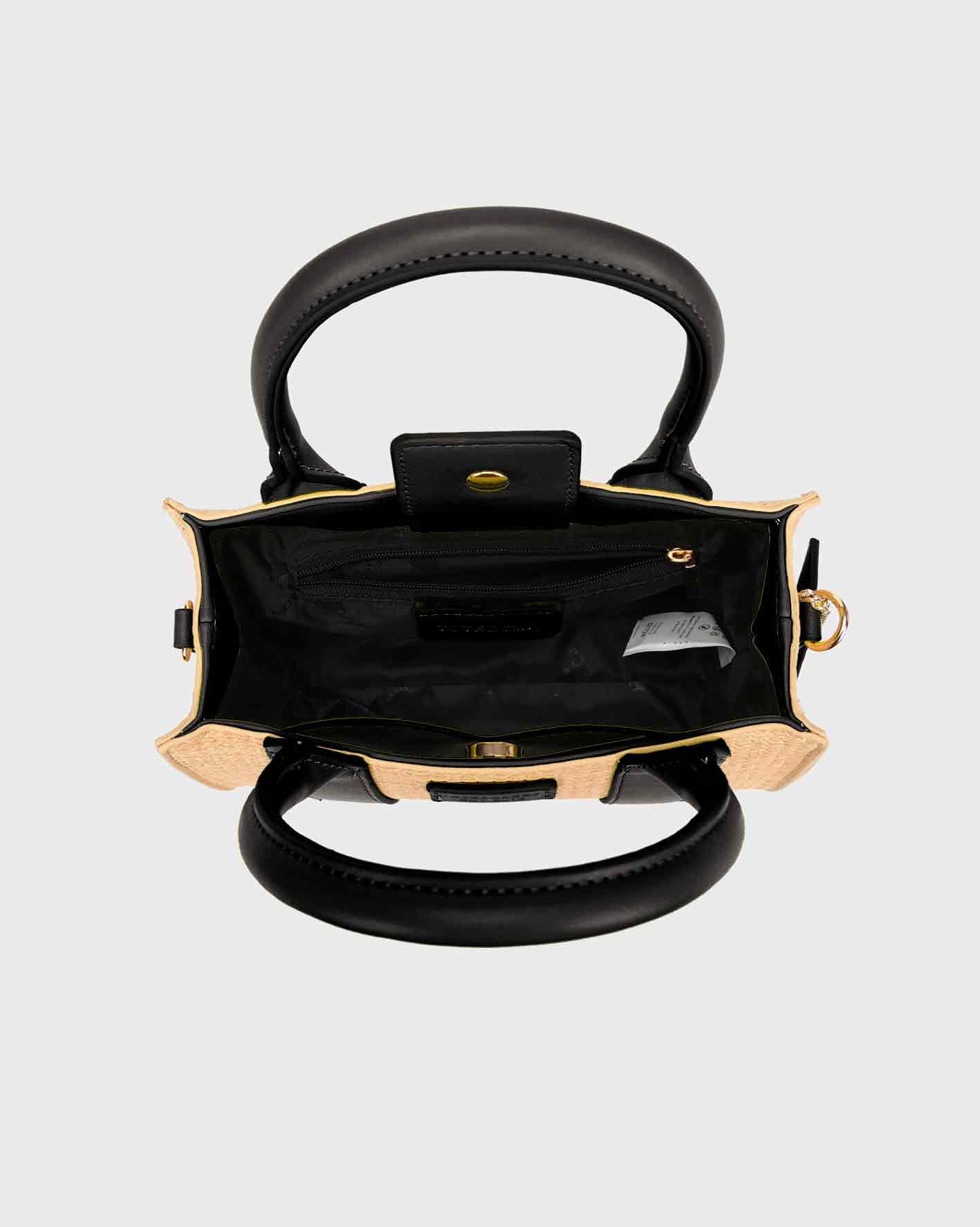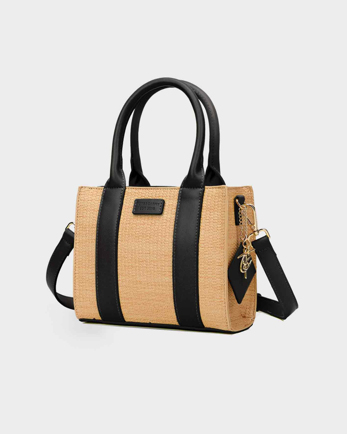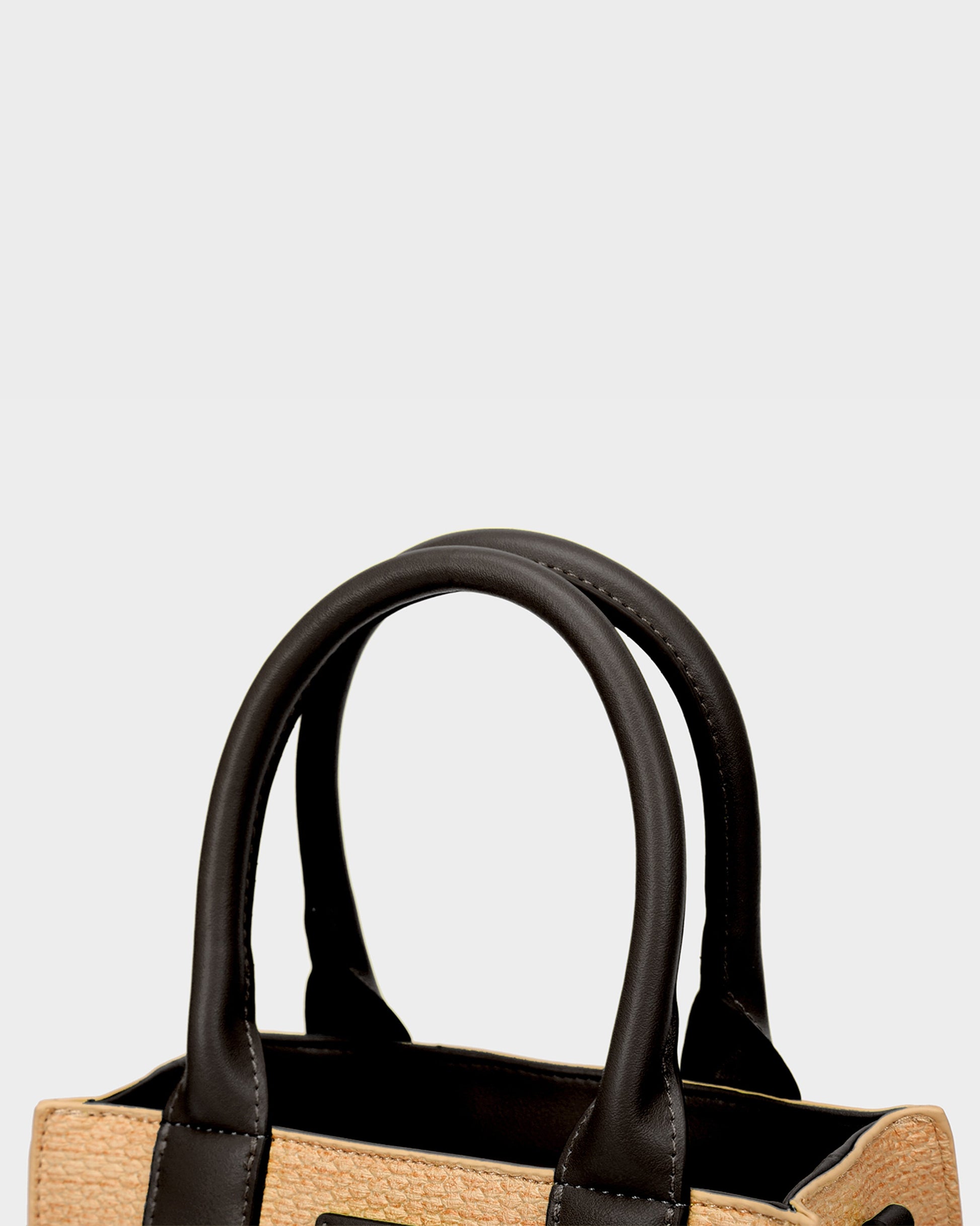 Add a touch of texture to your look with this unique Mini Tote Bag. This stylish tote features a beautiful woven body contrasted with smooth black leather accents, creating a visually appealing and tactile experience. The compact size and versatile design make it a perfect accessory for any occasion. Express your individual style ¨C grab the Mini Tote Bag now!