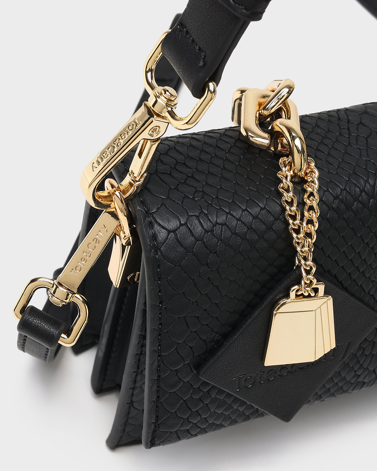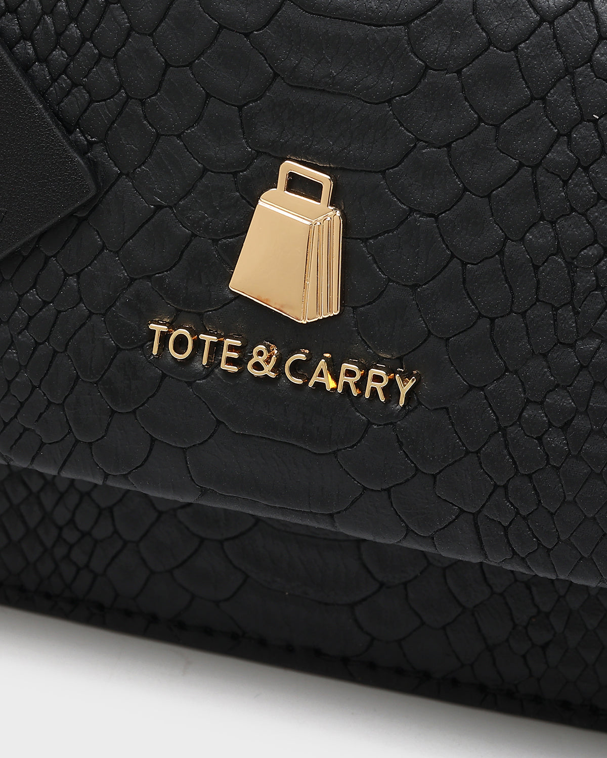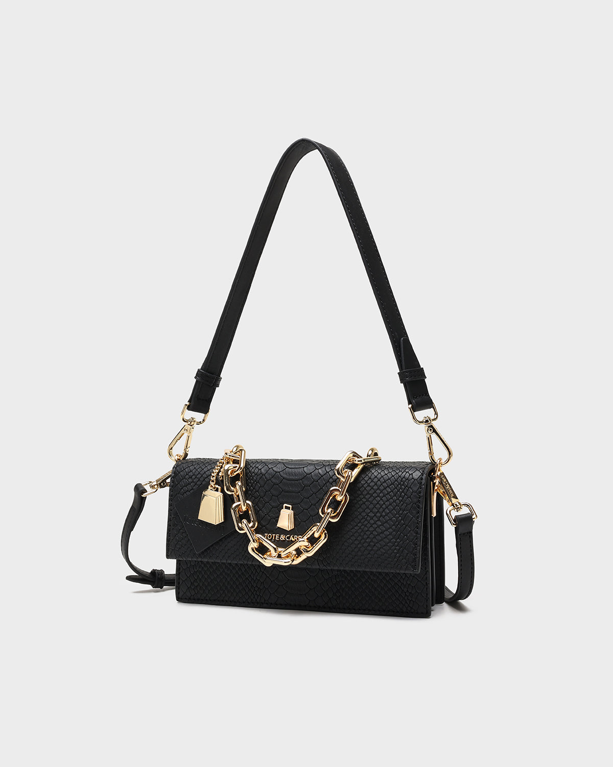 Elevate your style with the Sarah Black Purse, a perfect blend of elegance and functionality. Crafted from high-quality faux snakeskin leather, this purse features a stunning art-inspired handle and a gold chain strap, allowing you to switch up your look effortlessly. The snap front closure and secure inside zip pocket ensure your essentials are safe and organized, while the Tote&Carry name tag and purse charm add a touch of luxury.